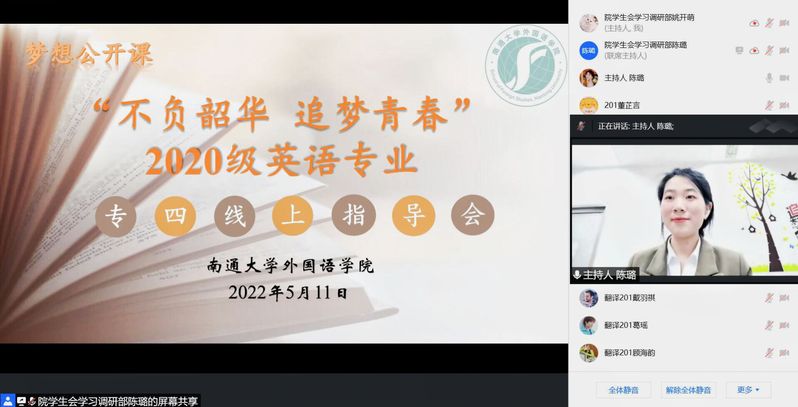 5月11日下午,小奶猫直播 举办了“不负韶华 追梦青春”2020级专四考试线上指导会,年级辅导员、班主任及全体2020级本科生参与了本次活动。