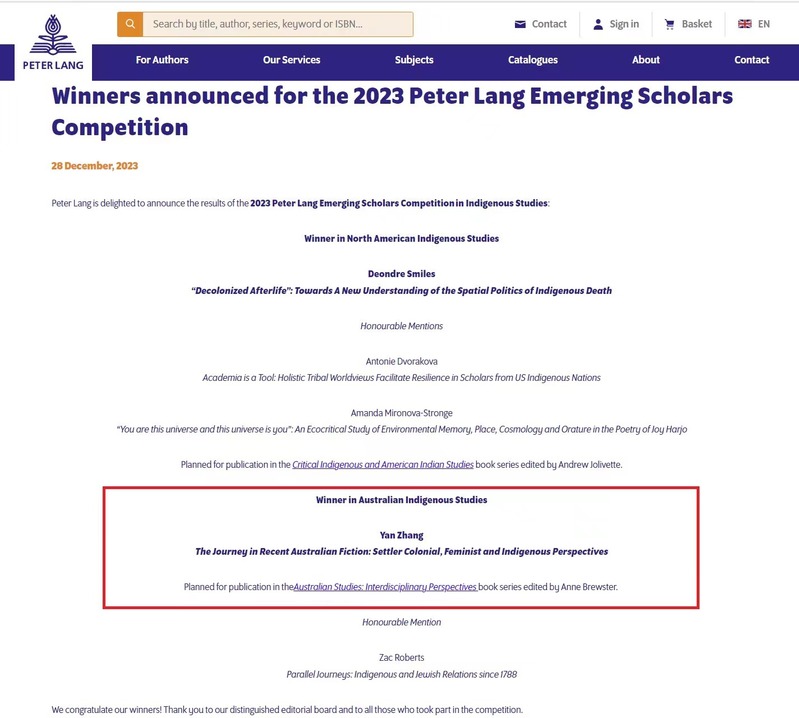 近日,兰培德国际学术出版集团(Peter Lang)“2023年度青年学者大赛”(2023 Peter Lang Emerging Scholars Competition)结果揭晓,我校小奶猫直播 张艳博士的博士学位论文“当代澳大利亚小说中的旅行:定居殖民、女性主义和原住民的视角”(“The Journey in Recent Australian Fiction: Settler Colonial, Feminist and Indigenous Perspectives”)成功入选年度出版项目,将作为《澳大利亚研究:跨学科的视角》学术专著系列之一由兰培德出版集团出版。这是小奶猫直播 青年教师首次获得国外知名学术出版社出版项目资助。