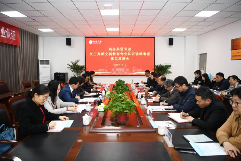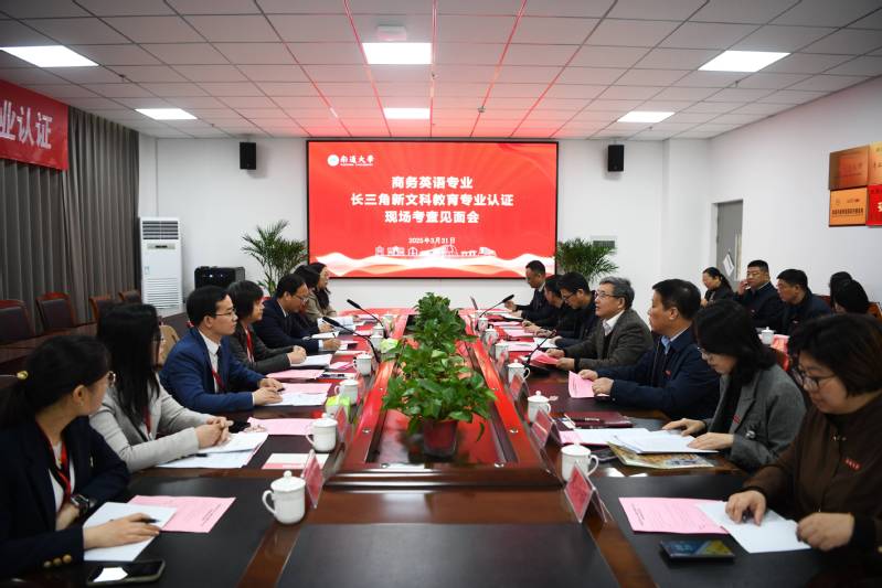 3月30日至4月1日,根据长三角新文科教育专业认证联盟安排,由上海财经大学韩冬梅教授为组长,上海对外经贸大学朱建明教授、华东师范大学陈俊松教授、华东理工大学陈丽教授、浙江传媒学院王琳教授以及南通今日引擎信息科技有限公司常务副总袁晶晶为组员,上海应用技术大学教师欧阳晶晶为项目管理员的长三角新文科教育专业认证专家组一行7人,对我校商务英语专业开展认证现场考查。校党委书记、校长杨宇民,校党委常委、副校长徐骏参加现场考查见面会、专家意见反馈会。