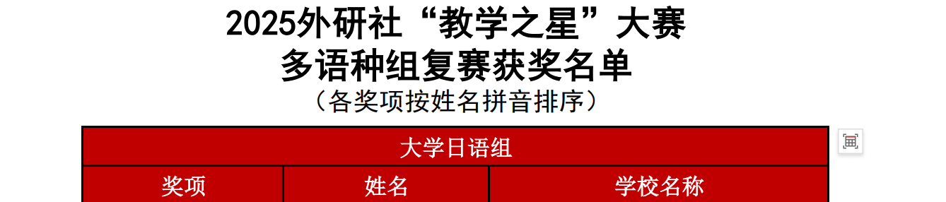 本次多语种组大赛涵盖日语、俄语、德语、法语、朝鲜语 / 韩语五个语种。自 2025 年 2 月启动,初赛阶段通过院校选拔与推荐,吸引了全国 200 余所高校的 500 余名多语种教师报名参赛。经评审专家组严格评审,最终评选出各语种复赛一、二、三等奖。